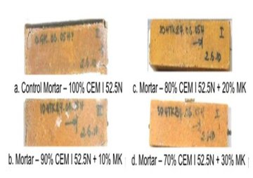 Calcined clays like metakaolin, when added to concrete as an additive or as replacement for cement, add to the durability of the concrete. The chemical resistance of concrete is improved due to the denser matrix and ITZ improvement of the calcined clays and reduction of free lime (Portlandite) in the cementitious matrix. Increased resistant to Alkali Silica Reaction is achieved through reaction of the aluminosilicate with alkalis to form stable compounds. These same actions also account for better resistance to chloride penetration through concrete. Lastly, addition of calcined clays also improved the sulphate resistance of tested mixes. This reaction is based on the highly densified matrix structure, the dense ITZ and conversion reactions of the ettringite (ATf) phases in the cementitious matrix to more stable AFm (monosulphatehydrate) phases. Figure 8 shows the results of testing in a cement sand mortar prism, wherein the levels of substitution of metakaolin in the cement binder were varied (0%, 10%, 20% and 30%) and the prisms stored in a sodium hydroxide solution for a fixed amount of time. The visual results of the 4 prisms are shown in Figure 8. It is seen that with higher levels of cement substitution, a better resistance to ASR deterioration is seen [7].