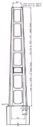 Fig. 23  Eldridge's Tower48 | But this might not have happened at all. A bridge across the Tacoma Narrows had been long felt, but finance was a problem. Clark Eldridge, a Washington State engineer, produced a tried-and-tested conventional bridge design, with a centre span of 2,600 feet (793m) and end spans of 1,300 feet (396m) each, using a 25-foot (7.62m) deep lattice-truss deck structure (Fig. 22) and braced towers [463ft 6in (141m) and 476ft 6in (145m) high], with five bracing struts above the deck and three below (Fig.23).46However, when the Washington Toll Bridge Authority requested the Federal Public Works Administration (PWA) for USD 11 million to build the bridge, Leon Moissief wrote to the PWA offering to build the bridge at much lower cost. His design, he said, would be much slimmer, much lighter and more elegant, and would cost USD 4 million less.49 The PWA approved his proposal, and Moissief completely revised the design of bridge, with a central span of 2,800 feet (854m) and end spans of 1,100 feet (335m), plate girder deck structure 8 ft. (2.44m) deep and with a reduced tower height (both 425 ft, 129.5m) having only two struts each above and below the deck. However, owing to some problems at the site Eldridge’s foundation design was retained. Moissief’s bridge had a span-to-width ratio of 72, significantly greater than 47 for the Golden Gate Bridge. It was the slenderest and lightest bridge (for its span) at the time - and that ultimately proved to be its undoing. But, would Eldridge's bridge have survived the conditions on that fateful day of 7th November 1940? Modern opinion is Yes. But would it have survived the design wind speed of 120mph? No one has given an answer.48 |