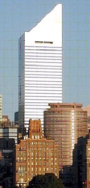 |  | When Citigroup wanted to build its new headquarters on Lexington Avenue, it chose a site which was directly across the street from its then headquarters. However, the site was occupied on the northwest corner by a crumbling St. Peter’s Church, built in 1905, but Citigroup wanted the whole site. So the church was able to negotiate a very advantageous deal : Citigroup could occupy the whole site - but above the church - provided that Citigroup also built a new church in the same place where it now stood! The church traded the air rights above it for a new church,  but created a major problem for the bank, since the main columns could now not be at the corners of the site. LeMessurier was the structural engineer and came up with an innovative idea of having four massive columns 114 feet (35m) high on the centre of each side instead of at the corners, with the bank building projecting (cantilevered) 72 feet (22m)over and above the church. It was a radical and very innovative solution - and very brave, but it was a magnificent "eye-catcher" unlike anything seen before, and the huge skyscraper "seemed to float" above the street ! It was a magnificent achievement. The building was built and opened in 1977. |
