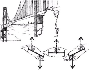 Bridge users had observed the tendency of these new light, long and slender bridges to oscillate on windy days, but that was explained away by bridge designers as a minor trade off against the aesthetics, lightness and economy of the bridges.37 The Tacoma Narrows Bridge was, at the time, the most slender suspension in the bridge in the world. The designers also "forgot" the suspension bridge design lessons of the previous century and amplitude failed to account for the dynamic effects of wind. The solid plate girders supporting the bridge deck acted as barriers to wind flow below the deck, while the wind flowed smoothly above, causing an aerodynamic uplift. Soon the bridge started oscillating and grew in until finally the deck structure ruptured and the bridge collapsed. It has always been popularly, but incorrectly, been explained as a classic case of "harmonic resonance" (or forced oscillations),but the more accurate explanation is now held to be a case of "aero-elastic torsional flutter" (self-induced oscillation) (Fig.21).47 However, even seven decades later the debate still rages on as to what exactly caused the failure, and the jury is still out.48