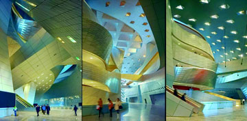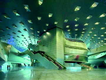 The center comprises of a conference center, theater and opera house. The theater has a capacity of 1,600 seats and a stage tower, exhibition center and parking, delivery and disposal. A public zone at ground level allows for differentiating accessibility for the different groups of users, with the shopping and exhibition facilities directly connected to the conference center providing dramatic sight axis within the building. The actual performance and conference spaces are situated at +15 m above the entrance hall. The grand theater, with a capacity of 1,600 seats and a stage tower, directly opposite of a flexible conference hall for 2,500 seats, is positioned at the core in the center of the building. With this arrangement the main stage can be used for the classical theater auditorium as well as for the flexible multipurpose hall. The main auditorium is additionally equipped with backstage areas like in traditional theaters and opera houses.