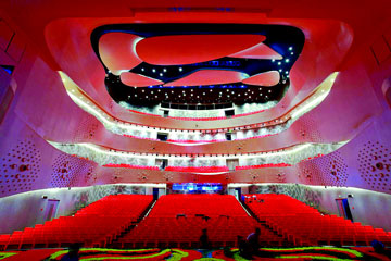 Architecturally as well as acoustically, the opera hall is the core of the building. The hall's design with three balconies connecting the lateral walls and rear walls is inspired by the traditional horse shoe shape; however it has been interpreted in an entirely new way. The curved balustrades merge into the proscenium walls and ceiling. Furthermore, all surfaces including the suspended reflector elements were designed acoustically as well as architecturally by means of a computer model. The aluminum wall panels with their varying perforation pattern form the characteristic design and are acoustically transparent, while by means of the height- adjustable acoustic banners behind the wall cladding, perfect acoustics can be ensured for each respective type of event. But, the hall even features another acoustic finesse: the Vivace system, originally designed for theater performances that has been complemented by an electronic room enhancement module.