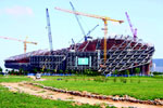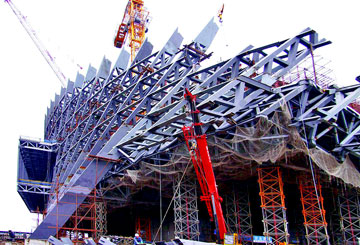 The structural concept is based on a sandwich structure composed of 2 elements: the 'table' and the 'roof'. The whole structure is elevated 7 meters above ground level and is supported by 14 vertical composite steel and concrete cores. A doubly ruled facade structure connects the two layers of table and roof, creating a load-bearing shell structure. The application of new design and simulation techniques, the knowledge of local shipbuilders to bend massive steel plates, and the consumption of more than 40,000 tons of steel enables breathtaking spans of over 85 meters and cantilevering of over 40 meters.