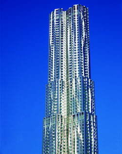 New York by Gehry is sheathed in a stainless steel curtain-wall with glass panels, has the unmistakably undulating, asymmetrical look of a Frank Gehry building. The building's soft, curvaceous folds, which are reminiscent of the folds in a piece of gently draped fabric, were inspired by the classical draping of 17th Century Italian sculptor Gianlorenzo Bernini.