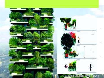 In Milan, Italy, high-rise buildings with large-size trees on the balconies are being built in an affluent neighbourhood. Residents can produce vegetables, fruits and berries for their own consumption just like any roof garden. Also, recycled treated water is used for irrigation and fertilisation. The second example pushes the limit of an existing city with jammed streets. The three pictures show the space that 80 people require if they travel by car, motor cycles or bus or walk. If public transport is being provided, most of the street is available for other activities. The street could be turned into a long garden providing fresh air to pedestrians as well as residents.