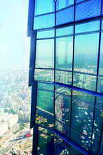 From this initial form, the massing was refined by gradually widening the re-entrant corners towards the top and inclining the upper third of the main façades by one degree to create the tower's elegant silhouette and improve its wind response. The tower's eight mega-columns splay out three degrees to widen the tower's dimension at its base, significantly reducing the tower's overturning moment, while providing longer clear spans for hotel and exhibition facilities. Design Principal William Pedersen sculpted the tower's curtain wall into a series of overlapping panels, each one-story high, which he likened to shingles on a roof or the scales of a dragon. The shingled curtain wall generates a kaleidoscopic play of light and shadow, as it mirrors different parts of the sky, de-materializing the tower's immense mass while relating to the viewer through the repetition of tangible human-scale elements.