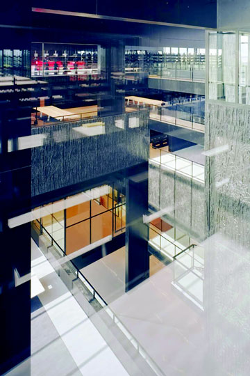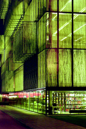 Besides housing 42 million books, the library was intended to being a place where people could work in a concentrated manner, to also become the intellectual social center for the suburban university campus, where students and others can come to study and meet at all times of the day. The 40 meter tall library and the adjacent, lower parking garage, both clad in glass and concrete imprinted with the same silk-screened figurative pattern, are sited on the major road and pedestrian pathway across the campus. The simple rectangular massing of the library and the repetitive rhythm of its concrete cladding and glazing, which is subtly modulated by the projecting operable sections, stands in stark contrast to the rich, plastic spatial complexity of the interior spaces.