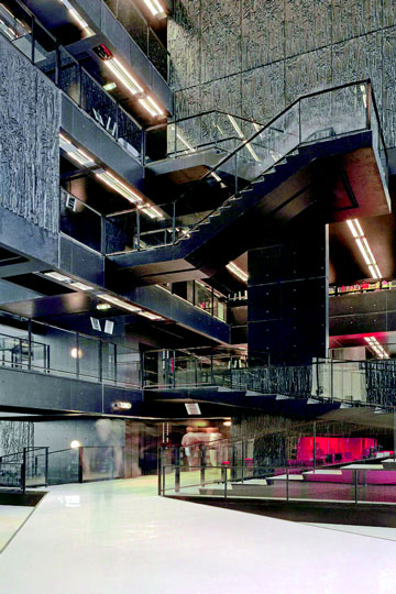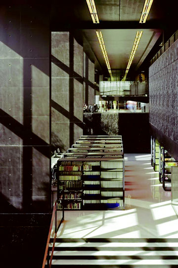 The books are stored in two primary volumes that seem to float up towards the ceiling. The massive, lifted book stack volumes are made of black-painted cast concrete, and the walls have a three-dimensional figural pattern cast into them which matches the two-dimensional pattern imprinted on the exterior glazing. While the black pattern on the glazing filters the natural light entering the building, the pattern embossed in the black-colored concrete walls acts to diffuse and bounce the light deeper into the interior spaces. At the center of the building, a vertical space, running from the ground to the roof, is opened between the two book stack volumes, which are interconnected by a series of stairs and sloping ramps. This central vertical space forms the experiential hinge of the building, interweaving the lines of movement, the spatial layers, and the internal views.