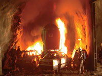 A concrete slab covered in a layer of shotcrete that was embedded with steel fibers withstood blast testing conducted at the Fraunhofer Ernst-Mach-Institute in Freiburg, Germany, much better than the traditional slab, maintaining 60 percent of its bearing capacity. © Goetz Vollmann/Fraunhofer Ernst-Mach-Institute |