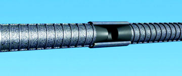 Cold-Swaged Coupling Sleeve: The cold-swaged coupling sleeve uses a hydraulic swaging press with special dies to deform the sleeve around the ends of the spliced reinforcing bars. This produces a positive mechanical interlock with the reinforcing bars. Bars to be spliced are inserted equal distances into the sleeve. Bars may be shear-cut, flame-cut, or saw-cut, however, a bar-end check is recommended. Bars of different sizes can be spliced with this system. This mechanical splice can also be used for joining reinforcing bars to structural steel members. Longer sleeves are required for splicing epoxy-coated reinforcing bars.
