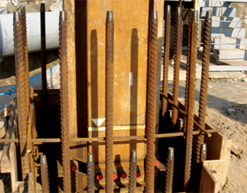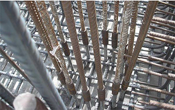 Grout-Filled Coupling Sleeve: The double-frustum-shaped coupling sleeve is filled with a cement-based, non-shrink, high-early strength grout. Reinforcing bars to be spliced are inserted into the sleeve and butt at the centre of the sleeve. The space between bar and sleeve is filled with non-shrink grout to transfer forces between the deformed surface of the bars and the deformed interior surface of the sleeve. No special end preparation of the bars is required except for normal cleaning. The relatively wide sleeves also can accommodate minor bar misalignments, and combinations of different size bars.