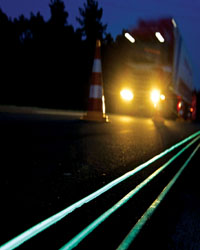 When the temperature drops under   freezing and the roads become slick, the paint would activate, covering   the road with a dusting of bright cartoon snowflakes. Similarly, a   glow-in-the-dark paint treated with photo-luminizing powder could reduce   the need for auxiliary lighting. Charged in day light, the   glow-in-the-dark road illuminates the contours of the road at night for   up to 10 hours.
