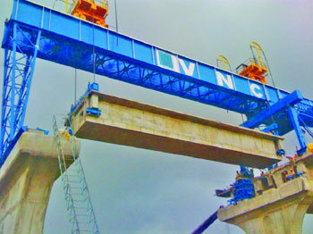 Main girder, may be of Box girder or twin plate girder or Lattice Girder, is designed to take the lifted RCC girder loads along with the impacts etc. Lifting arrangements consists of hoists with lifting hooks to lift RCC segments from trailers and help them get suspended to Sliding Beams. These Sliding Beams are then moved to the predetermined locations using winches. They act as hangers for suspending RCC precast segments till they are joined together and pre-stressed. After pre-stressing, the entire girder will be resting on bearings which are on the pier pedestals and Sliding Beams are relieved from all loads. Sliding Beams are also used as counter weights during the auto-launching of LG. Counter weights normally consist of RCC precast girders placed on the rear end of the Main Girder. They are designed to maintain not only the stability of LG but also to prevent the main girder from toppling during traversing.