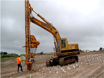Vertical Drains are used to accelerate the consolidation of soft, low permeability soils. Drains are installed in a grid pattern designed to achieve the optimum time v. cost outcome. The most common forms of drain are strip or "Wick" drains and are introduced into the ground using a mandrel containing the drain material being installed into the soil. The mandrel is pushed to the design depth, where it releases the drain and is withdrawn leaving the drain in place. Menard Bachy has developed the use of small diameter circular plastic tube drains, which are more efficient than the flat "Wick" drains. These circular drains have particular application in the Vacuum Consolidation process.