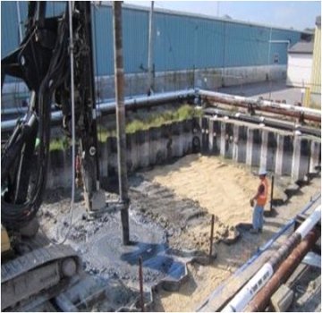 In-situ deep mixing using hydraulically operated helical blade augers penetrates the ground to the required depth. The hollow stem of the auger is used to inject cement slurry/lime/any other stabilising compound into the ground. A pair of 2 or 3 augers is operated simultaneously. After injecting the stabiliser into the ground, the augers are rotated such that the soil along with the stabiliser is churned in-situ and mixed the stabiliser thoroughly with the soil without necessity of taking out the soil. The auger configuration can be chosen such that either a stabilised wall can be formed (to act as barrier) or the entire area can be stabilised.