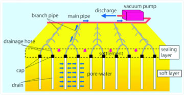 Vacuum Consolidation is an effective means for improvement of saturated soft soils. The soil site is covered with an airtight membrane and vacuum is created underneath it by using dual venture and vacuum pump. The technology can provide an equivalent pre-loading of about 4.5m high conventional surcharge fill. Vacuum-assisted consolidation preloads the soil by reducing the pore pressure while maintaining a constant total stress. Some of the applications are;