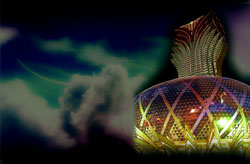prosperity. At night, the ‘Starsphere’ base of the building is like
