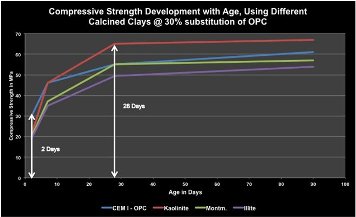 In terms of reactivity of the optimally calcined clays, the potential performances of the three types of clay are excellent. However laboratory tests indicate that the performance in clays increases from illite to monmorillonite to kaolinite. This was demonstrated by substituting 30% of OPC with the calcined forms of the three clays above. Observations from the tests show that 2-day compressive strength for the composite cements is lower, but 28- and 90-days compressive strengths are comparable. Of the three types of calcined clays, kaolinite shows the best performance. Figure 9 shows comparative compressive strength development of composite cements based on the different types of calcined clay.
