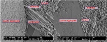 Fig. 6: Comparative SEM images showing improvement in the ITZ for normal OPC and an OPC-metakaolin blend