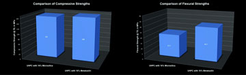 In our laboratory tests, the mechanical properties of UHPC based on metakaolin was evaluated and compared to UHPC based on microsilica. The compressive and flexural strengths of the two mixes were measured. It was seen that, although the compressive strength of the two UHPCs were comparable, there was a marked difference in the flexural strengths of the two concretes. Subsequent SEM studies showed that the substantially higher flexural strengths were due to the platy morphology of the unreacted metakaolin. Figure 7 shows comparison of the compressive and flexural strengths of the two UHPCs [5].
