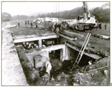 The Explosion The pumps were then switched on and immediately there was a blinding flash and a massive explosion. It destroyed the pump house and blew up the roof, lifting some 30 beams each weighing about 2.5 tons into the air through the soil landscaping above, before they crashed down again, instantly killing eight of the visitors and seriously injuring the rest. Eight more died of their injuries later. The dead included two children. (Fig.26)