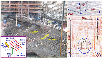 The main bone of contention were the supports for the upper layer of slab reinforcement by means of 'bar-chairs' made from 32mm steel rebar bent into a hat shape. (Figure 11, left.)