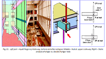 Fig. 10.  Left pair - Hyatt Regency Walkway, before and after collapse; Middle - Nut at upper walkway; Right - Static analysis of single vs. double hanger rods