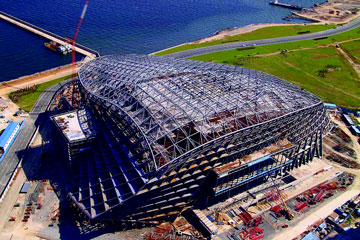 The structural concept is based on a sandwich structure composed of 2 elements: the 'table' and the 'roof'. The whole structure is elevated 7 meters above ground level and is supported by 14 vertical composite steel and concrete cores. A doubly ruled facade structure connects the two layers of table and roof, creating a load-bearing shell structure. The application of new design and simulation techniques, the knowledge of local shipbuilders to bend massive steel plates, and the consumption of more than 40,000 tons of steel enables breathtaking spans of over 85 meters and cantilevering of over 40 meters.