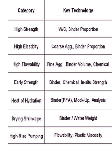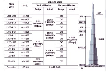 High performance concrete is specified as the main structural material for the tower from the early design concept of the project considering all the factors discussed above. However, Dubai is very corrosive environment and all concrete works requires high standards of care at every level and for every aspect of the concrete works. The concrete specifications for the Burj Khalifa is somewhat performance based design and required high strength, high modulus of elasticity, low shrinkage, and high demands for durability and serviceability requirements. This type of specification allowed the contractor to take full advantage of the high performance concrete technologies available and allowed for a very innovative approach to concrete works. Table 1 below provides a comparison summary of the concrete materials specified and the actual concrete used.