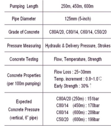 Preliminary horizontal concrete pump simulation test, Figure 5, was performed at the early concrete planning works to estimate the friction losses on the 600m pipe length, to confirm the concrete pump capacity, and the behaviour of the concrete pumping system, including pumping system details, hydraulic pressure, concrete delivery pressure and number of strokes per minute. The purpose of this test is to also verify the concrete mechanical properties and characteristics before and after concrete pumping. Table 3 below provided a summary of the horizontal concrete pumping system and the concrete testing programs.