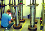 An extensive Creep and shrinkage testing program was performed at CTL laboratory in the Skokie, Illinois, and USA and at Samsung C & T Own Testing Laboratory in Seoul, Korea. The testing programs were performed in accordance with ASTM C512 Creep and Shrinkage Test. The concrete was tested for both sealed and unsealed conditions, and loaded at 7 days and 28 days at 25% and 40% the tested concrete compressive strength. Because the high performance concrete mixes are designed for high strength, high durability, low water cement ratio, low shrinkage, and pumpability, most of the concrete mixes revealed very low shrinkage values and most of the shrinkage tend to occur very early. See Figure 4 for a typical Creep and Shrinkage test setup.