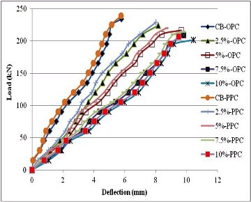 PPC concrete beam specimens perform better than OPC concrete beam specimens both in case of load carrying capacity and in crack width behavior.