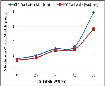 Effect of corrosion on crack width is small in the initial stages (0 to 5%) of corrosion. After 7.5% corrosion level, crack width increases rapidly.