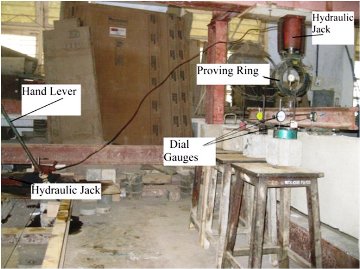 Beam specimens were tested under two point loading condition (Figure 6). Dial gauges were fixed at the top side as shown in Figure 7 (two at load points and one at centre) to measure the deflection for each load increment. The load was applied at15kN increments. Proving ring of 50 tonne capacity was used to note the applied load.