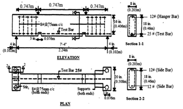 NBS beam specimens of size 2.44mx0.457mx0.203m were designed as under reinforced sections as per IS 456-2000 for the present study. A total of thirty specimens were cast. Mass concreting was adopted as specimens were of large size. TMT rebar of 25mm diameter bar was placed at a cover depth of 50mm from bottom, 12mm hanger bar at top and side bars were provided with a stirrups of 8mm diameter (Figure 2).