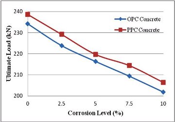 Results of ultimate load and maximum crack width against corrosion level are shown in Figure 10. As the degree of corrosion level increases load carrying capacity decreases (Figure 10 a). It is seen that for every percentage increase in corrosion level there is about 1.6% decrease in load carrying capacity.