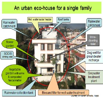 A single house with such water and energy installations does not require much extra work by the residents, while they remain almost self-reliant of water and energy. Most of the services to increase sustainability are built into the house as indicated in the Figure below. Flat roofs, a water sump under the house and a recharge well in the garden for excess rain water are constructed together with the house. Vegetable gardens, bushes and fruit trees can be watered with nutritious recycled water. Little storm water and waste water leave the compound.