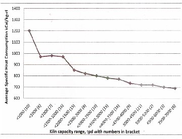 Specific heat consumption versus plant size for Indian cement plants [Indian, Cement Manufacturers Association]