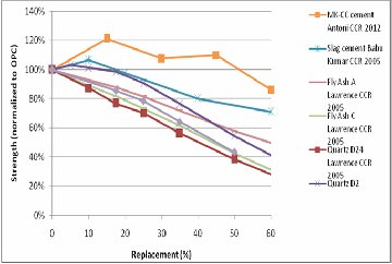 The pozzolanic activity of calcined clays has long been known. Kaolinite is by far the most reactive clay when calcined and relative pure "metakaolins" are available commercially, but at a price 2-3 times that of cement. It has been shown that relatively impure clays, with as little as 40% kaolinite content, can also give excellent strength in cement blends [14]. Such low grade clays are widely available throughout the world. Nevertheless, the need for calcination presently puts these materials at a disadvantage compared to SCMs which are waste products of other industries, even though calcination does not produce "chemical" CO2 and the optimum calcination temperatures of 600-800°Care very much lower than the temperatures needed to produce clinker. Recently we demonstrated that co-substitution of clinker with a combination of calcined clay together with limestone, can give good mechanical performance as early as 7 days at substitution levels of 45-60% [15]. In Figure 6 the strength at 7 days of these blends is compared to common SCMs and inert quartz as studied by Lawrence et al [Error! Bookmark not defined.].