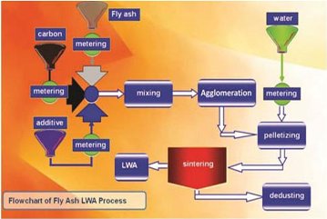 The process uses above 90% Fly Ash as major raw material mixing with small volume additive, carbonaceous solid fuel and water. The additive can be clay, and coal contributes the carbon depending on the particle size and loss of ignition in fly ash. After agglomeration and pelletizing, the green pellets will be transferred to a sinter machine for sintering. The physical characteristic of LWA product is superior to Natural Aggregates.