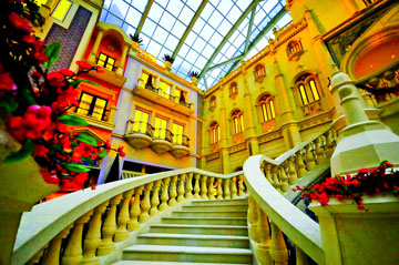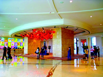 The hotel features colorful hand-blown glass adornments by Dale Chihuly, including the massive "Fiori di Paradiso" chandelier and distinctive sculptures by Dali and other artists in the main lobby and entrance. The interior rooms and restaurants also feature the work of famed designers such as Super Potato and Wilson & Associates. The suites and villas can be accessed through private VIP lobbies featuring two-story ceilings painted with 24-carat gold filigree, handmade floor-to-ceiling tapestries and marble and lapis-lined floors, walls and exclusive VIP elevators. MGM Macau’s centerpiece, the 1,088 square meters Grande Praça features a 25-meter high glass sky dome and European-inspired facades, including the main facade which is fashioned after the Estaça˜o Rossio, Lisbon’s central rail station. The Grande Praça is visible from a number of restaurants as well as areas of the upper gaming floor and is host to a variety of special exhibitions, shows, displays and various special occasions and events.