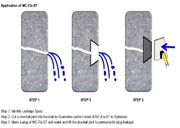 The application is very simple. First chisel the leakage spots or the cracks in dove tail fashion, as illustrated in the diagram. Remove loose particles, dust etc and moisten the prepared surfaces. Mix MC-Fix-ST in small quantities with water, knead it into a paste and mould it into a plug shaped mass. Hold it immediately against water leak in the prepared joint and press to ensure that no voids are left. Hold it in place until it sets either with hand or trowel. The setting time can be accelerated by using warm water to adjust with the work rhythm.