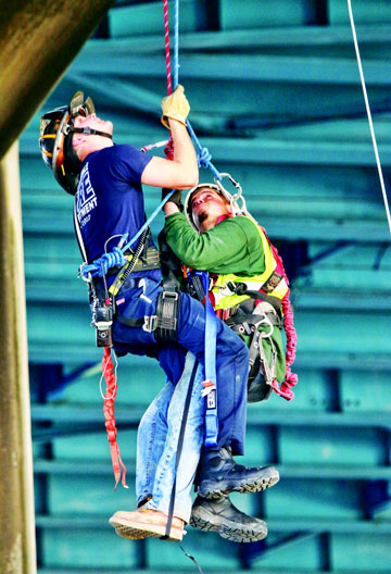 Fall Protection - Fall protection equipment shall be used when working six feet or more above the floors and outside the confines of protective guardrails, or when three points of contact on a ladder cannot be maintained. Fall protection shall be worn on projects where such systems are required (articulated boom lifts). Fall protection equipment shall be worn by the personnel when heights less than six feet are particularly hazardous (i.e., when working over machinery or objects capable of impalement).