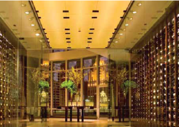 Engineered with a stiff internal concrete core and outriggers, Trump Tower's design allows the facade to be opened up and sheathed in a diaphanous glass curtain wall. The facade is adorned with clear anodized aluminum and mirror finished stainless steel that reflects and refracts light from the sun. Outset from the glass surface, the mullion system provides density and thickness as well as a metallic quality to the otherwise flush glass wall.