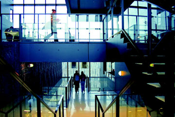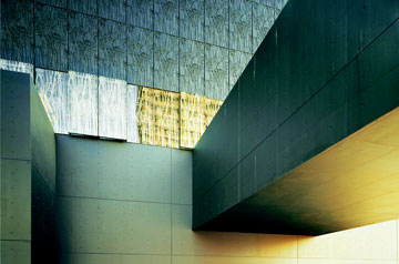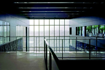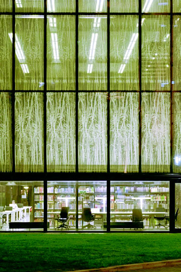 Besides housing 42 million books, the library was intended to being a place where people could work in a concentrated manner, to also become the intellectual social center for the suburban university campus, where students and others can come to study and meet at all times of the day. The 40 meter tall library and the adjacent, lower parking garage, both clad in glass and concrete imprinted with the same silk-screened figurative pattern, are sited on the major road and pedestrian pathway across the campus. The simple rectangular massing of the library and the repetitive rhythm of its concrete cladding and glazing, which is subtly modulated by the projecting operable sections, stands in stark contrast to the rich, plastic spatial complexity of the interior spaces.