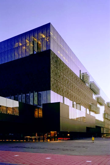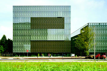 The book depots, which seem to float, divide the space into zones and are interconnected by stairs and slopes. All in black figured concrete on which a partly double-glazed facade to which a silk-screened figurative pattern has been applied in order to let natural light into the building encases the reading rooms rest. The glass facade also encloses the car park like a smooth skin, thereby making it an integral part of the complex. On one side it is the university site where the view from the raw interior offers a filtered prospect of the open countryside surrounding it, on the other, there is the view of the long slopes situated beside the inner courtyard that work as blinds to filter the view of the car park.