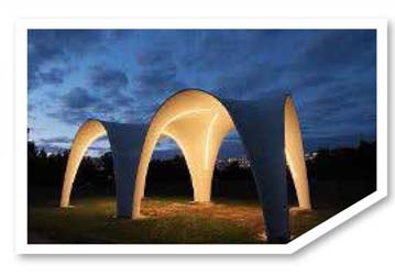 Illuminated pavilions on campus demonstrate the use of curved shell structures made of carbon fibre-reinforced concrete, a project of the Lightweight Construction Research Group at the TU Chemnitz.