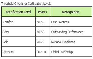 Different levels of certification (one star to five stars) are awarded based on percentage of points earned. The minimum percentage required for certification is 50. Buildings scoring 50–60 percentage points, 61–70 percentage points, 71–80 percentage points, and 81–90 percentage points will get one star, two stars, three stars, and four stars, respectively. A building scoring 91–100 percentage points will receive the maximum rating, which is- five stars.