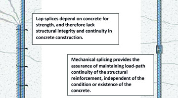 From the structural perspective, the most important benefit of using mechanical splices is to ensure load path continuity of the structural reinforcement independent of the condition or existence of the concrete. Additionally, mechanical splices reduce congestion of the reinforcing concrete by eliminating laps.
