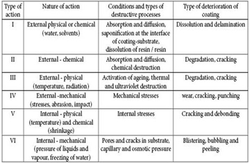 A wide variety of reactions is possible for resin degradation. The transport of gases and liquids aggressive to substrate into or through the coating is the major problem of its delamination. Various mechanisms of deterioration of resin composites and coatings are summarised in Table 2. There are many parameters that influence the deterioration process of coatings, such as chemical agents, temperature, solar radiation, pressure, abrasion, cyclic temperature-moisture changes etc.
